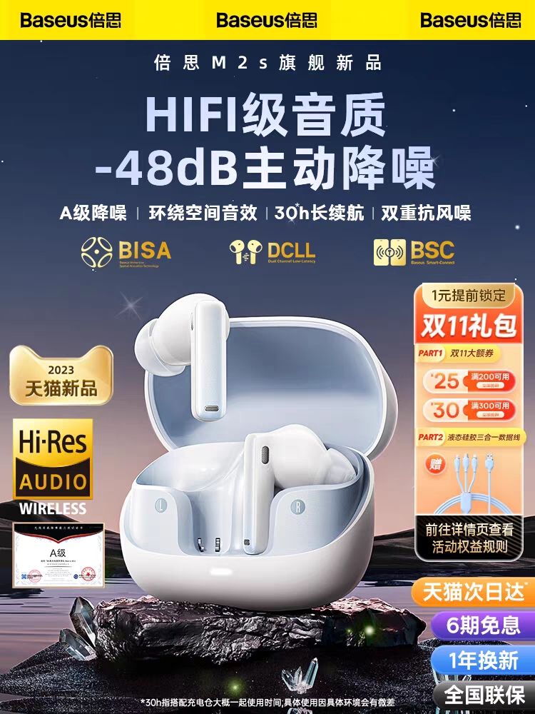 倍思m2s蓝牙耳机无线主动降噪高音质适用华为苹果