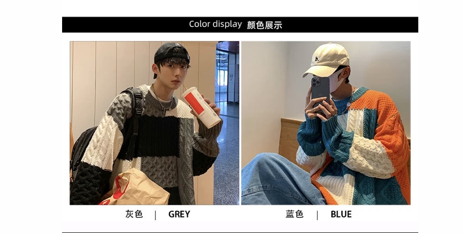 秋冬季加厚提花毛线衣日系复古撞色拼接毛衣男ins潮牌套头针织衫