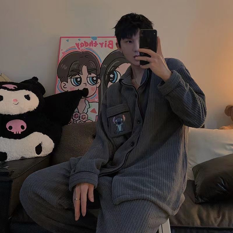 韩国史迪仔卡通情侣款睡衣女冬季加绒加厚法兰绒高级感秋冬家居服