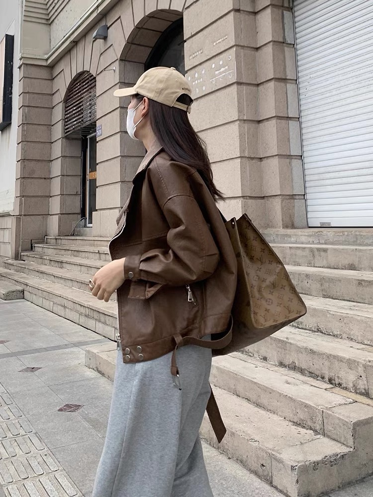 棕色皮衣外套女秋季新款韩版宽松显瘦西装领机车服短款pu皮夹克潮