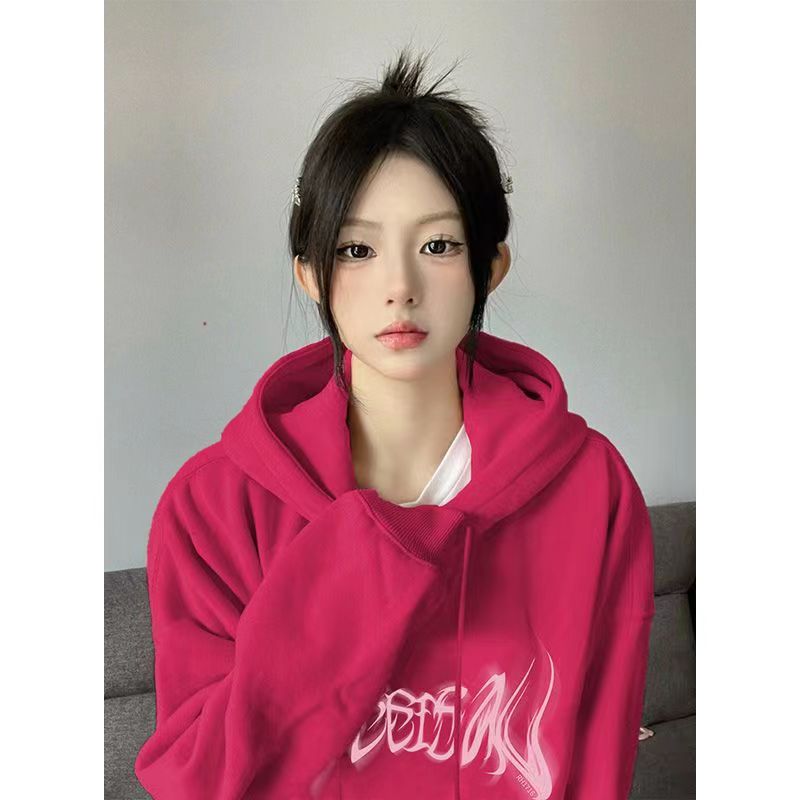 美式复古火龙果色连帽卫衣女宽松春秋季小众设计感慵懒风上衣外套