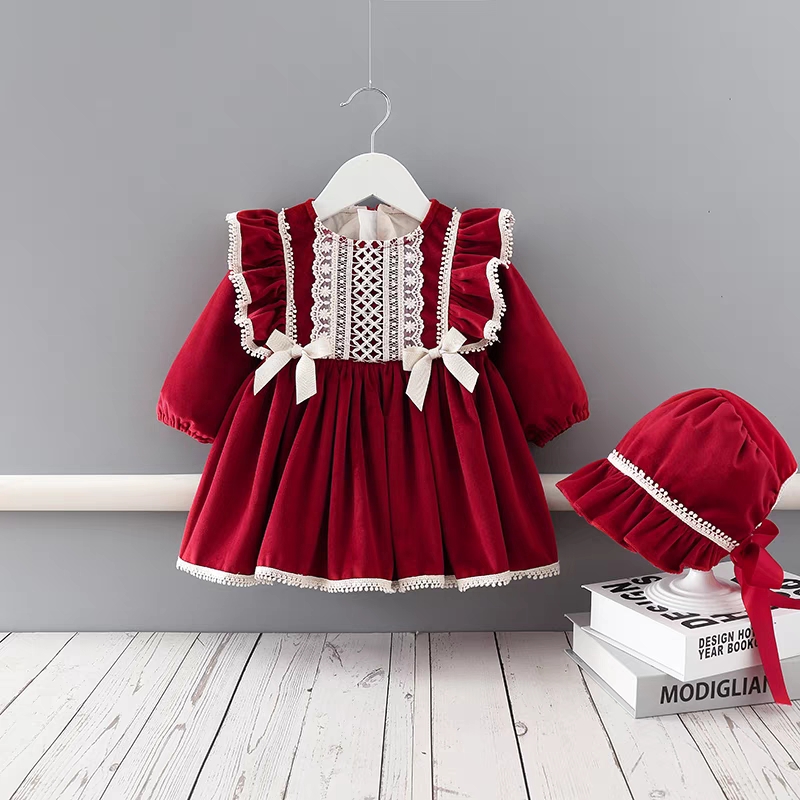 新贝母婴2023年冬季新款女童连衣裙丝绒酒红西班牙加绒礼服公主裙