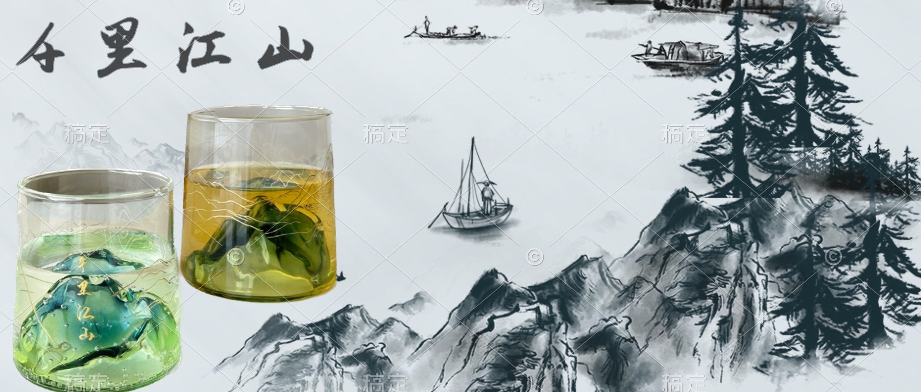 青绿千里江山杯,一山一水一世界,一杯一皿一朦胧。倒入茶水,透过光线折射,与杯内茶水辉映成趣,闪耀千变万化之美。