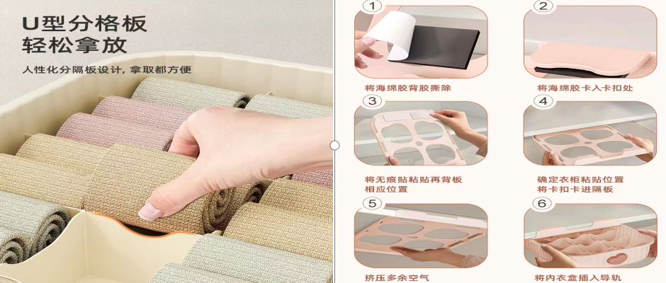 抽拉式拿取方便,免打孔悬挂,U型分隔板,拿取轻松
