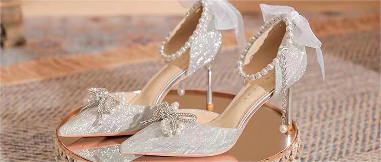 银色高跟鞋女2023新款蝴蝶结水晶鞋婚鞋细跟尖头18岁成年礼