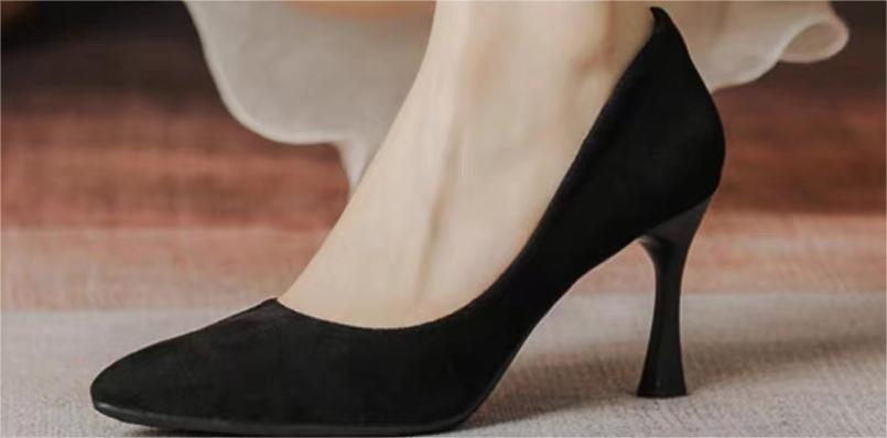 学生礼仪高跟鞋2023春秋细跟尖头舒适中跟黑色绒面职业工作单鞋女