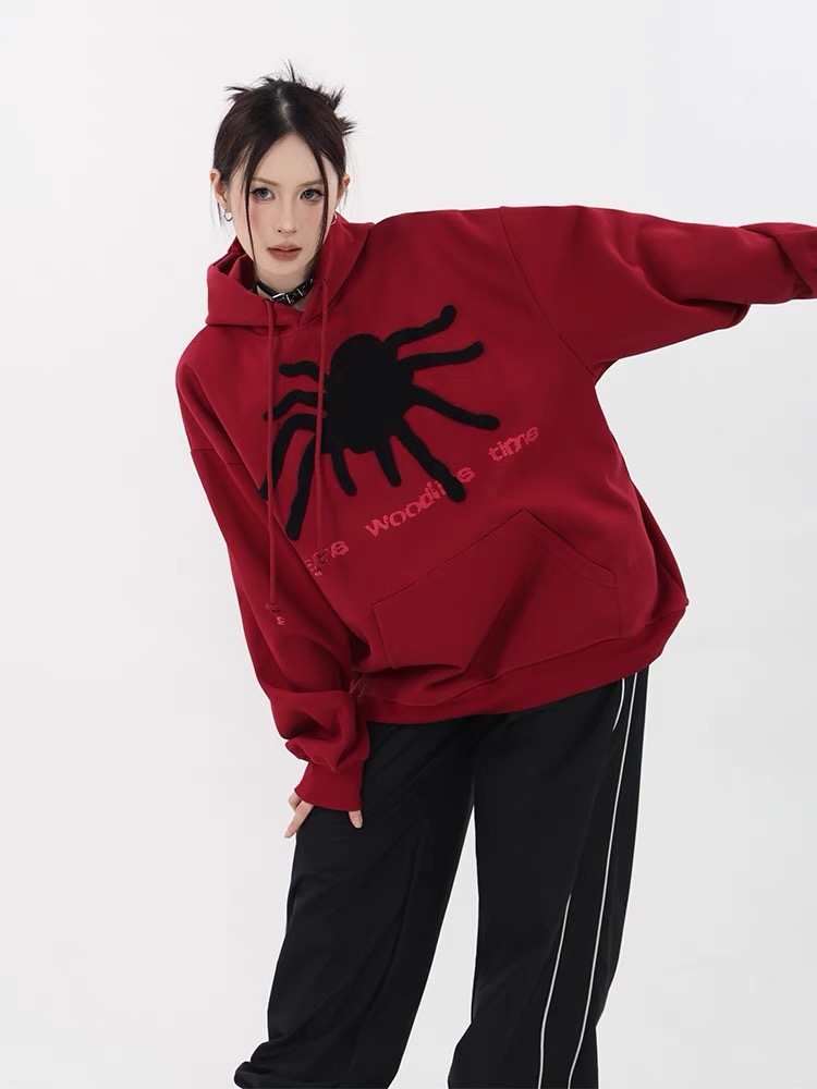 美式复古宽松加绒连帽蜘蛛卫衣外套女潮秋冬新款