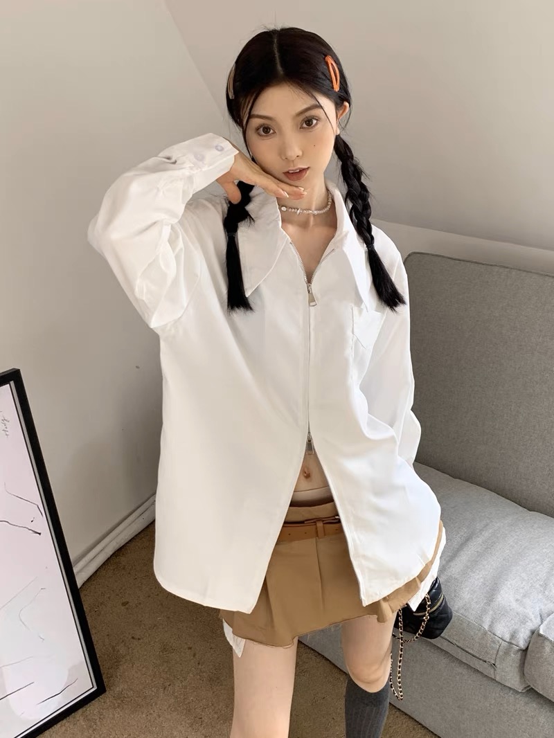 法式双拉链白色长袖衬衫女秋季设计感小众宽松显瘦衬衣高级感上衣