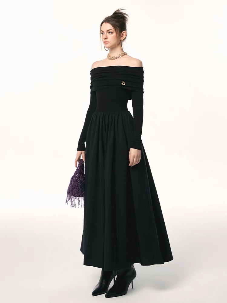 小众设计感一字肩刺绣收腰黑色礼服连衣裙