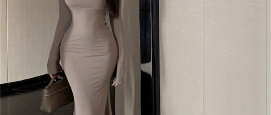 复古纯色连衣裙女秋冬长袖修身打底内搭裙子收腰中长款包臀鱼尾裙