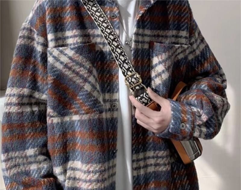 安紫小香风格子衬衫呢大衣外套男秋冬季慵懒风高级感飞行夹克潮大码