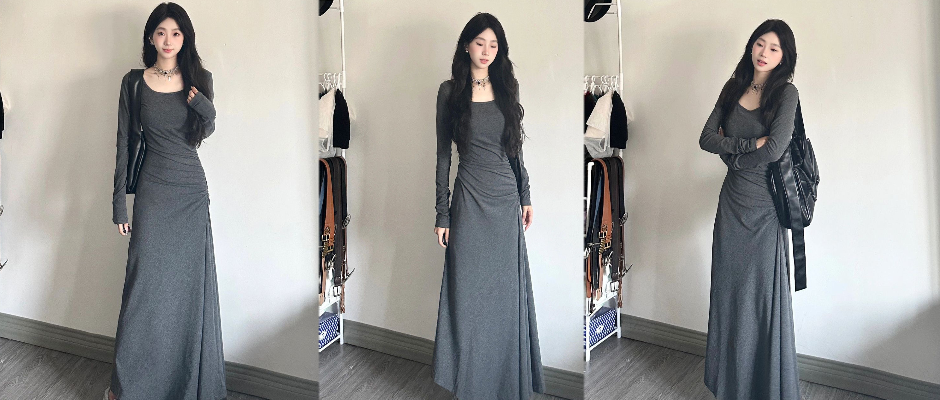 辣妹纯欲长袖连衣裙女秋季修身收腰显瘦灰色过膝长裙方领垂感裙子 灰色 S