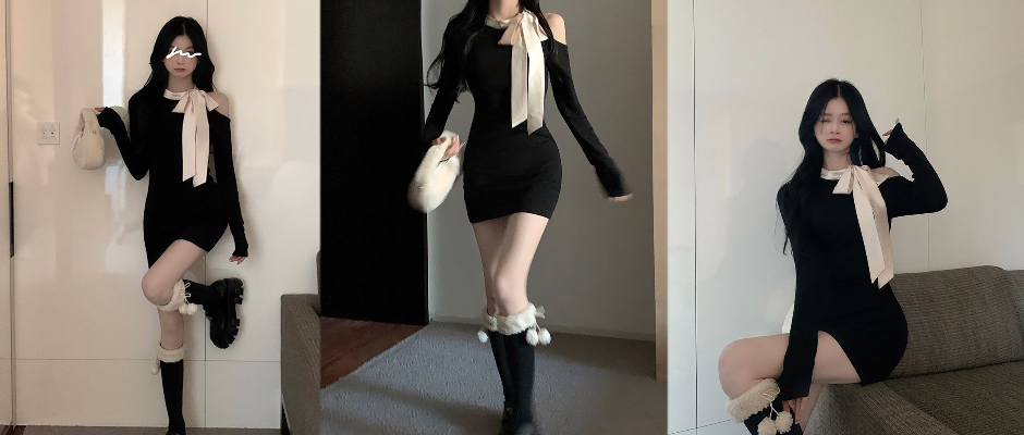 辣妹蝴蝶结长袖连衣裙女甜辣妹短裙气质显瘦修身露肩包臀小黑裙 裙子 黑色 S