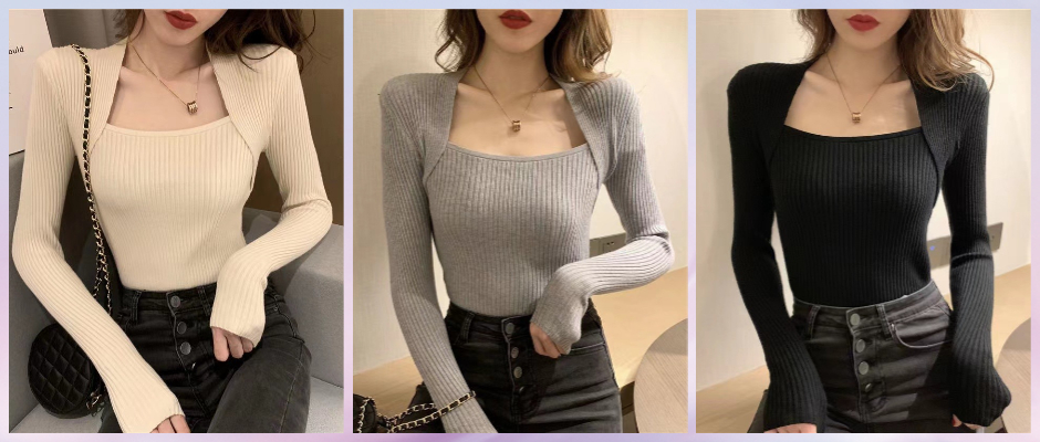 秋冬新款方领长袖打底衫女毛衣纯色修身温柔风辣妹假两件针织上衣 灰色 s
