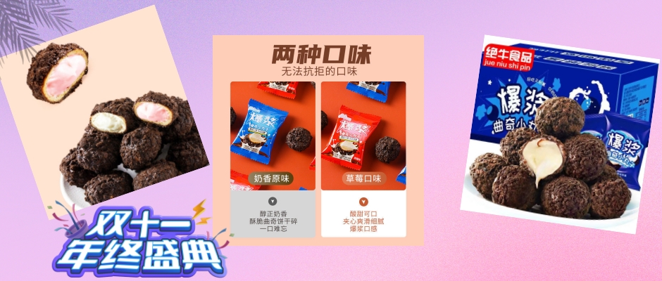 爆浆美味曲奇小丸子、两种口味妙不可言、双重美味给你双重口感体验。黄金配比、特调香浓夹心,平衡酥脆与香浓酥脆中藏有有一丝的细腻口感。特调流芯,一口纵享丝滑口感!