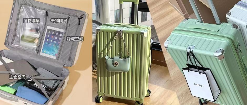PC耐磨材质,结实耐用,科学搭配融合,在板材柔韧的同时兼顾抗冲击能力,抗压100kg;静音顺滑,万向无阻,不易生锈;铆钉加固,防撞包角,硬度高,能更好的稳固箱体,保护箱内物品不受到挤压和碰撞;有隐藏式挂钩,加厚合金可调节拉杆,防盗密码锁和回弹把手。