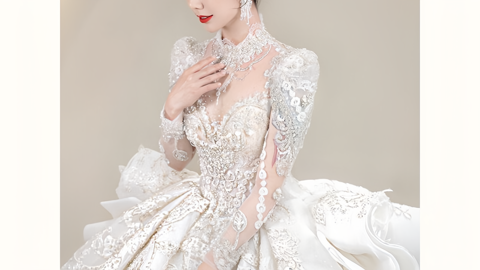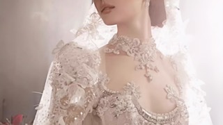 这款婚纱比较建议小清新或是人文气息浓厚的新娘选择,飘逸的头纱、镂空的蕾丝花边加上小碎花的透明褶皱,让新娘穿上后能营造出自然浪漫的风格,这也是这款浪漫婚纱最好的体型