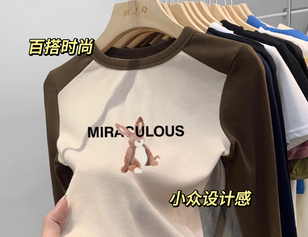 2023新款纯棉正肩拼色长袖t恤女时尚百搭洋气修身内搭上衣春秋季