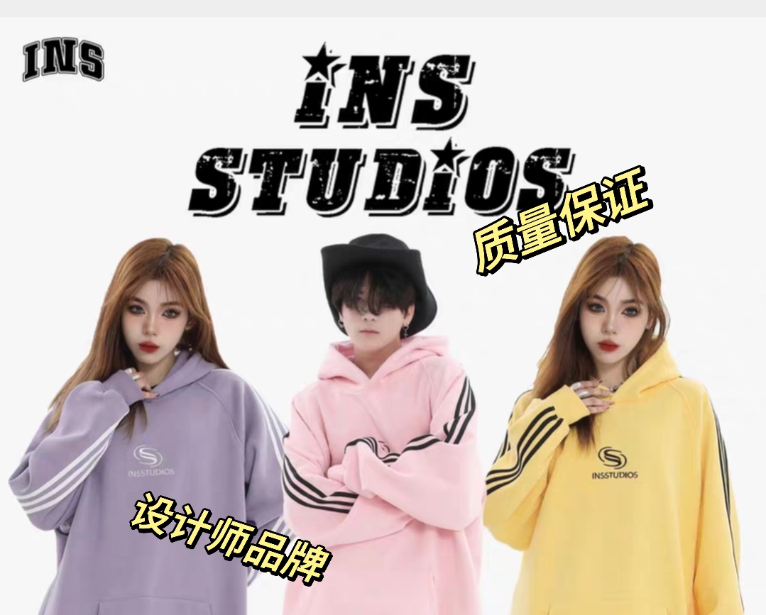 INSstudios 国潮牌情侣美式小LOGO三条杠条纹卫衣重磅加绒连帽衫