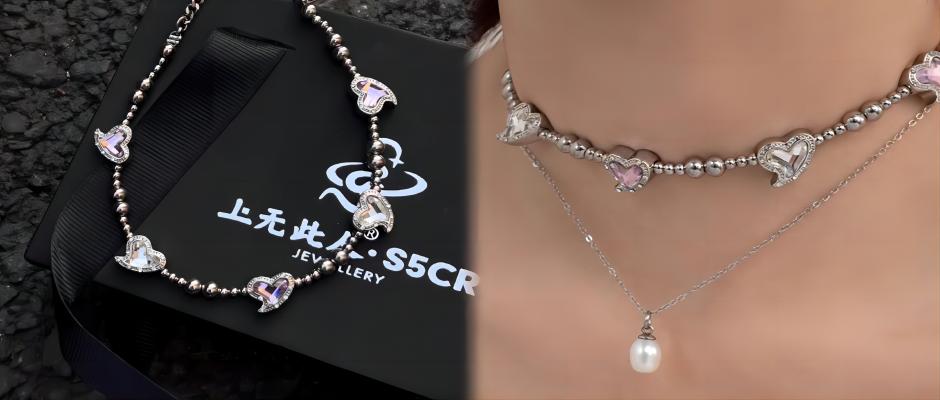 S5CR富家千金项链原创爱心锆石粉色短款锁骨链珍珠吊坠女轻奢送礼