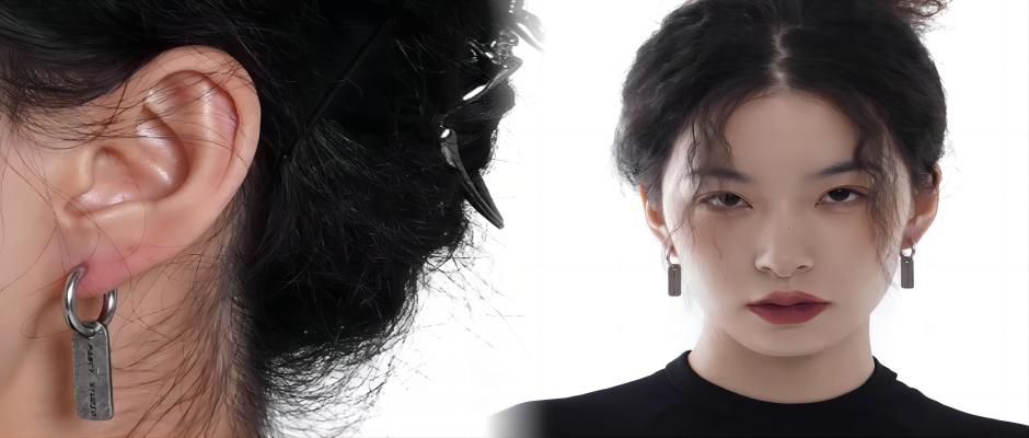 PANCY原创美式复古吊牌耳环冷淡中性字母情侣耳钉钛钢古银色潮酷
