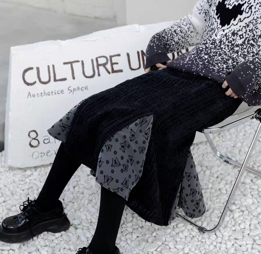 #抓住蝴蝶啦 重工的拼接半身裙,黑色暗格纹面料做了植绒工艺,摸上去的格子是带有绒绒的手感,面料还夹杂了银丝,我们在阳光下拍摄的时候裙子是会有 blingbling 很好看的波光粼感.高腰的版型,穿上去非常显高显瘦。下摆做了类似鱼尾裙的感觉,拼接了蝴蝶图案的植绒网纱,仙气十足!