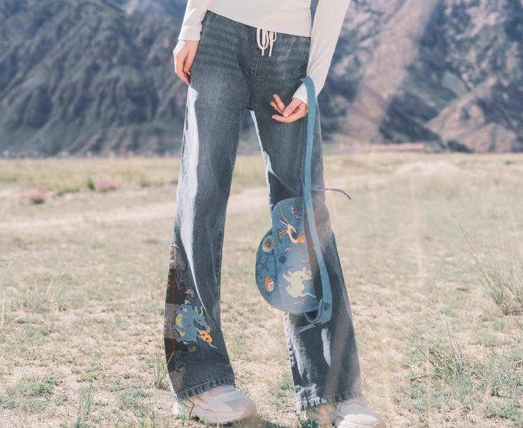 裤装采用了舒适柔软 的牛仔面料, 上身柔软垂顺,厚度 适中,适合春秋季穿着。 帅气利落的牛仔裤, 释放出秋日里的元气感。 牛仔裤腰部做松紧设计, 同时添加抽绳,可自行调节围度。 单侧裤脚口撞色贴布绣花。腰部做了松紧抽绳的设计, 裤型宽松,穿着舒适。