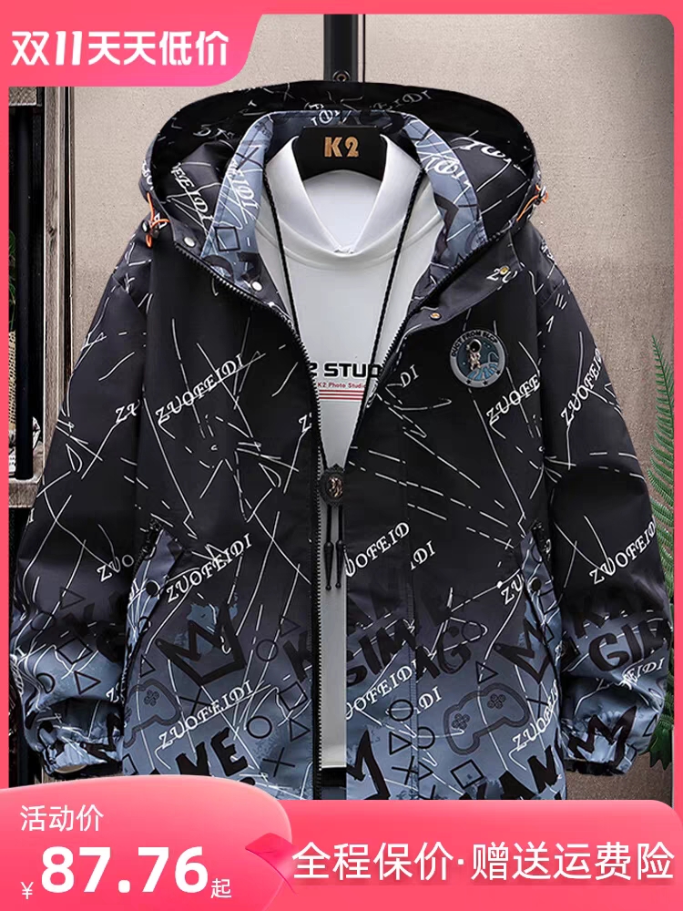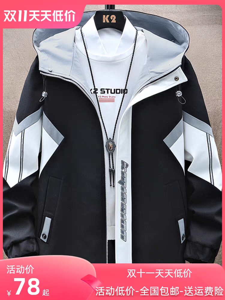 休闲夹克男士春秋薄款连帽防风上衣青少年潮流撞色冲锋衣加绒外套