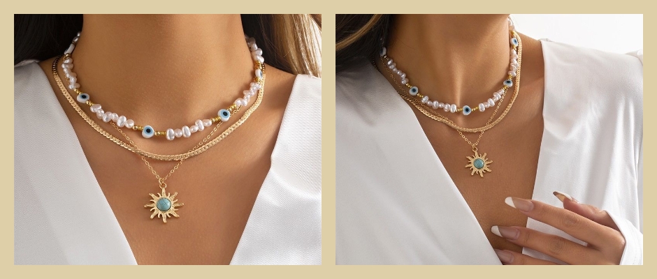 限日限定恶魔之眼项链多层个性欧美风太阳吊坠气质不规则珍珠爱心 金色