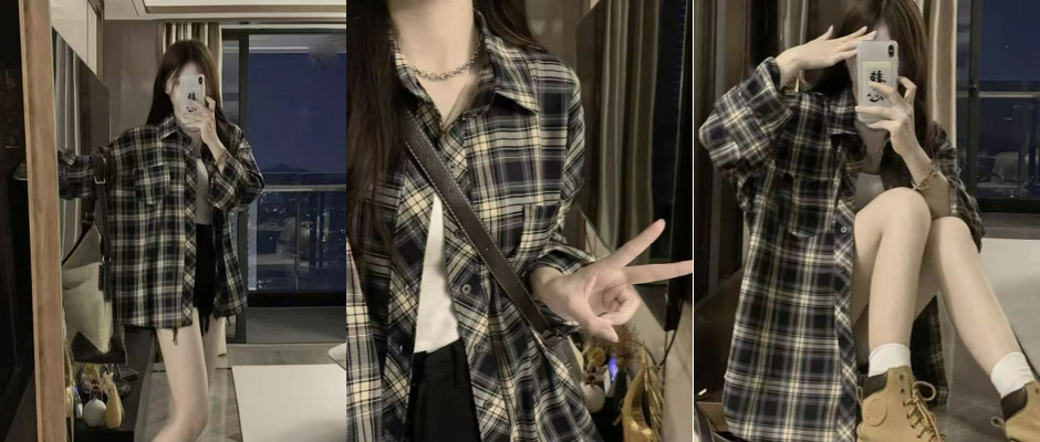 韩版藏青色格子衬衫设计感长袖上衣女开衫春薄款宽松外搭百搭外套 藏青色 xl