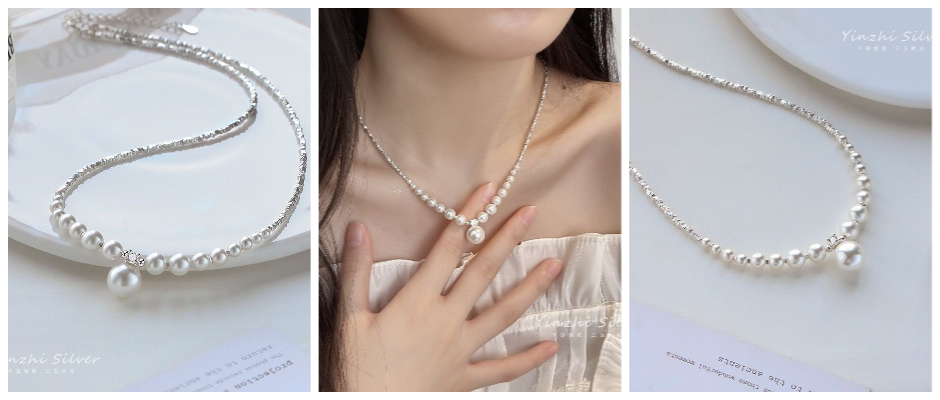 纯银碎银项链珍珠 白金