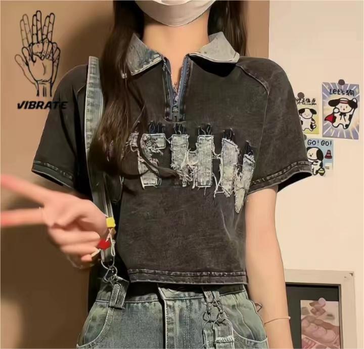 VIBRATE潮牌做旧牛仔领polo衫刺绣短款t恤女拼接字母拉链甜辣上衣