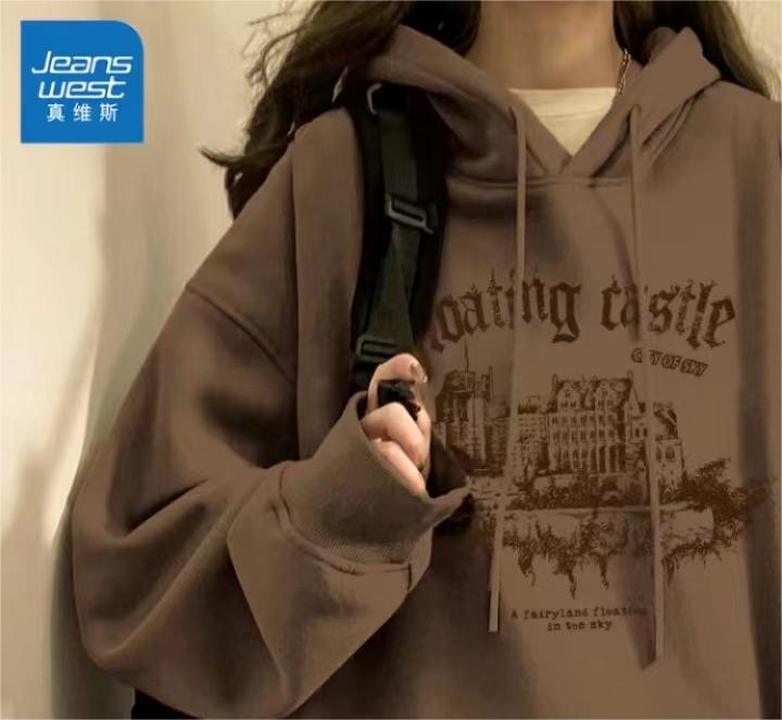 真维斯美式复古棕色卫衣女春秋2023新款爆款连帽外套长袖薄款上衣