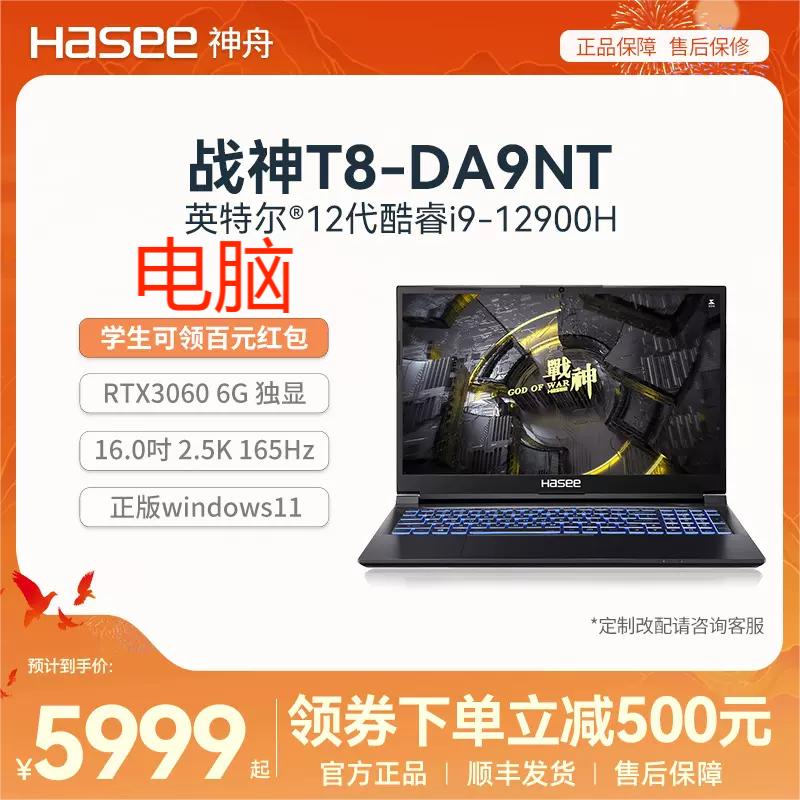 神舟12代战神T8-DA9NT:十四核酷睿i9-12900H RTX3060满血独显直连窄边框带背光吃鸡游戏本2022年热销款