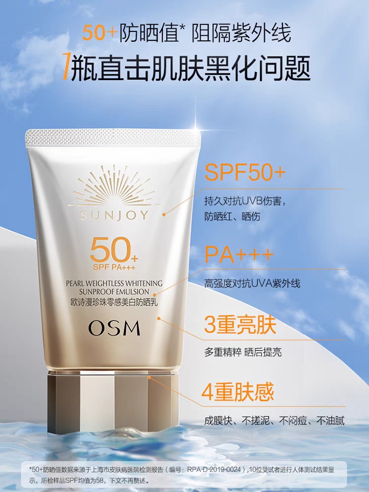 一直用这款的防晒,容易推开很服贴,价格亲民,出门胳膊腿都抹一下,还带点美白,好用好用防晒霜收到了很多天都没来评,最近用了很不错,之前也用了欧诗漫的,不是这款,是黄色的,这款有美白效果,用完再来买