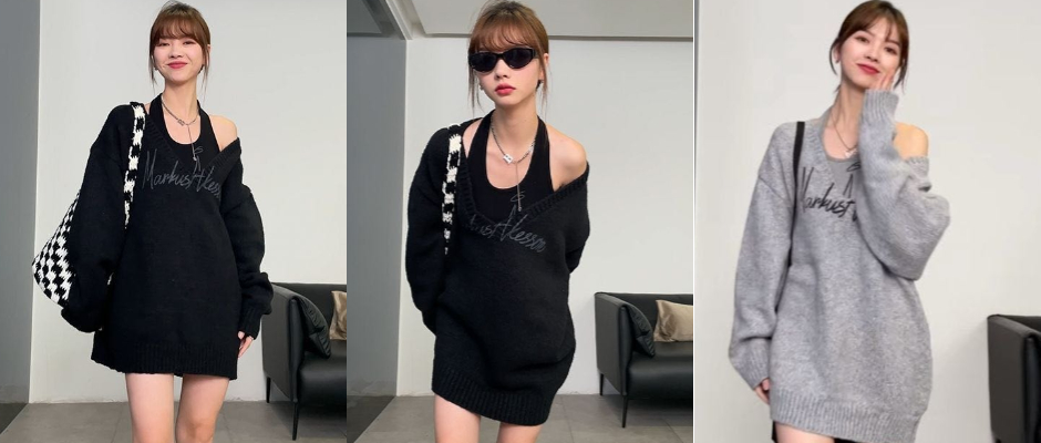 气质设计感小众辣妹宽松V领中长款毛衣针织衫ins挂脖小吊带两件套 黑色 l