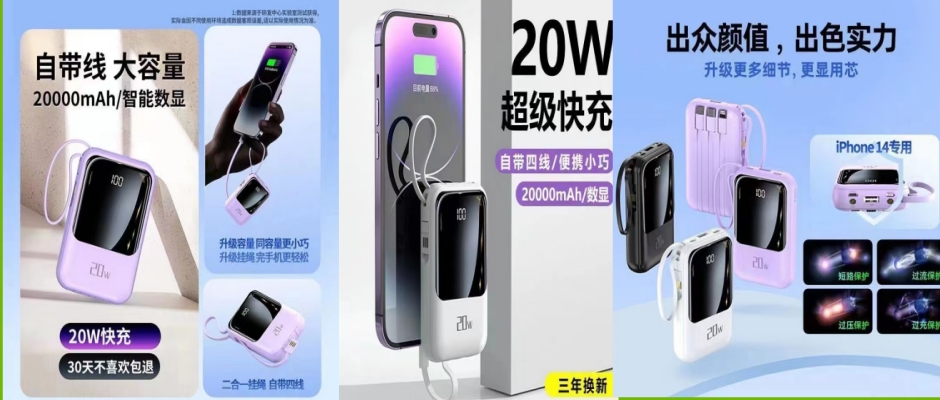 充电宝2023新款自带线20000毫安大容量便携耐用迷你超薄移动电源