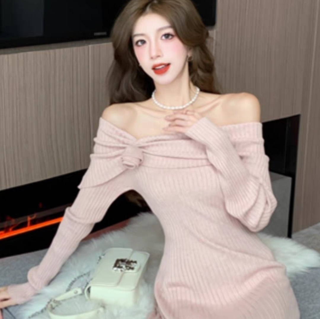 时尚减龄一字肩针织连衣裙女2023新款秋冬修身显瘦毛衣裙打底长裙 长款 粉色 S