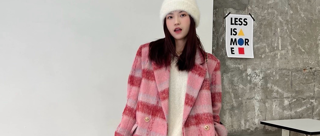 小众复古外套女呢子韩版宽松中长款秋冬新款粉色格子加厚毛呢大衣