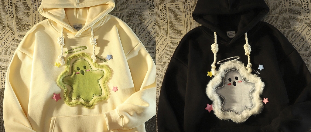 F.NY复古刺绣小幽灵加绒卫衣女冬加厚慵懒风oversize宽松连帽外套