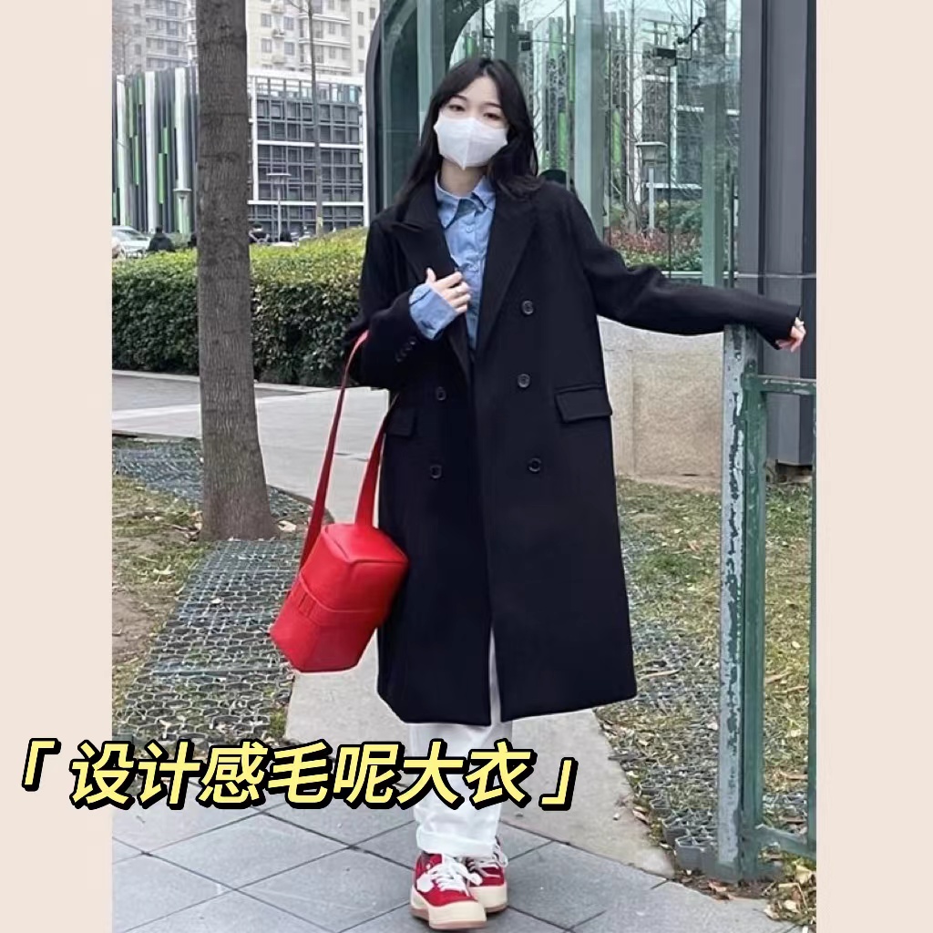 秋冬加绒加厚中长款过膝毛呢外套女洋气小个子上档次西装呢子大衣