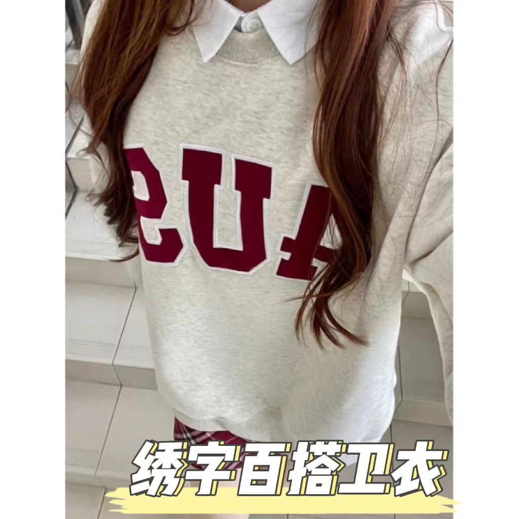 设计感小众字母圆领卫衣女秋冬oversize情侣装高级感加绒加厚上衣