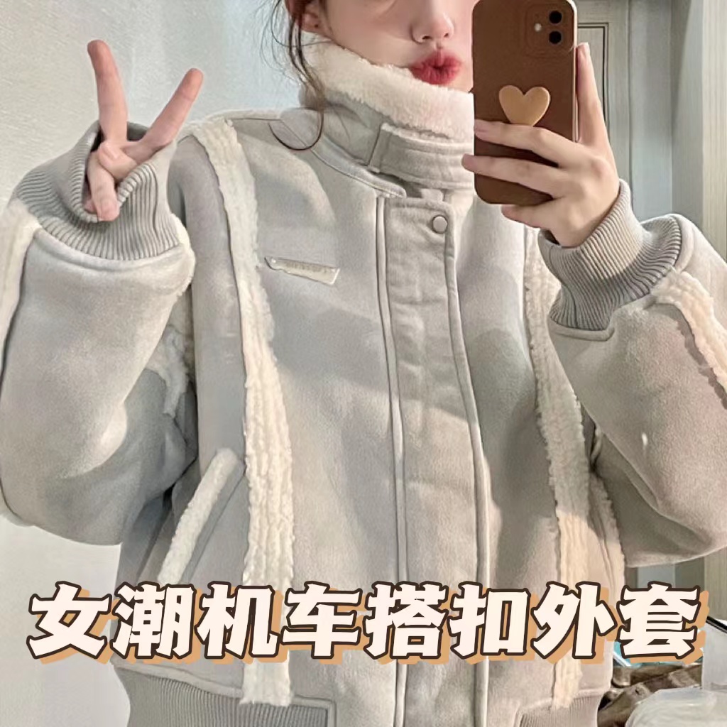 【皮毛一体】冬季复古机车搭扣羊羔毛拼接小个子短款加厚外套女潮