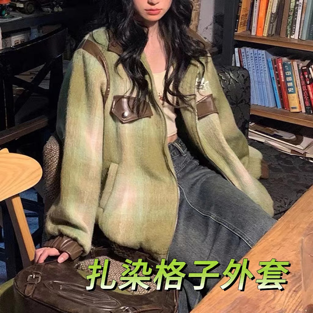 【夹棉加厚】秋冬美拉德复古慵懒风拼接口袋翻领扎染格子毛呢外套