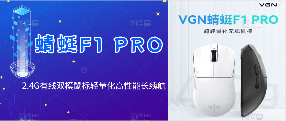 VGN 蜻蜓F1 Pro双模鼠标的包装很小巧,天蓝色的设计,整体风格非常清新。大大的VGN的Logo显示了它的身份。VGN 蜻蜓F1 Pro采用常见的右手型的对称式设计,尺寸较小,对小手用户也非常友好。整体鼠标为简洁的白色,黑色的滚轮起到了点缀的作用,银色蜻蜓的Logo若隐若现。