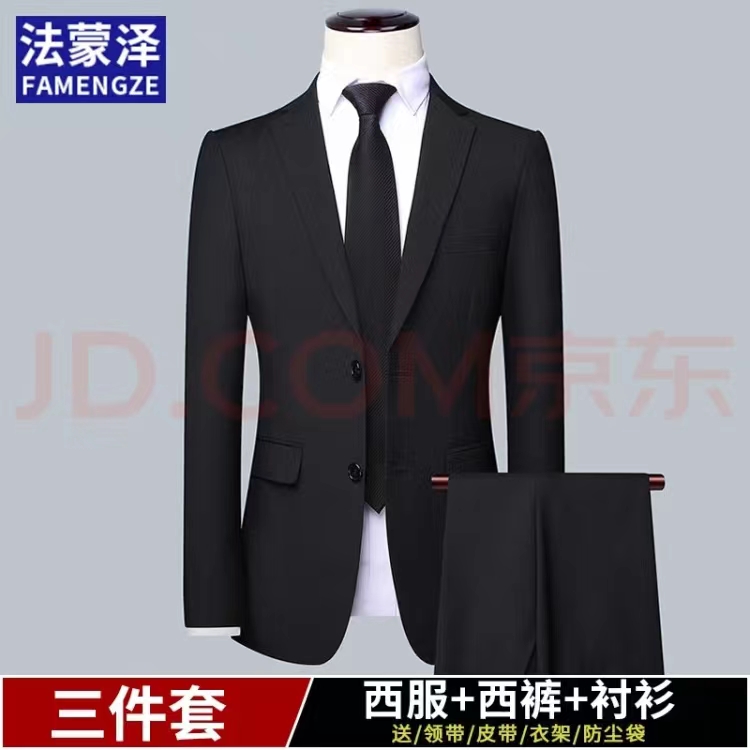 法蒙泽西服套装男士三件套商务职业正装小西装男结婚新郎上班修身外套男 黑色(西服+西裤+衬衫) XL【115-130斤】