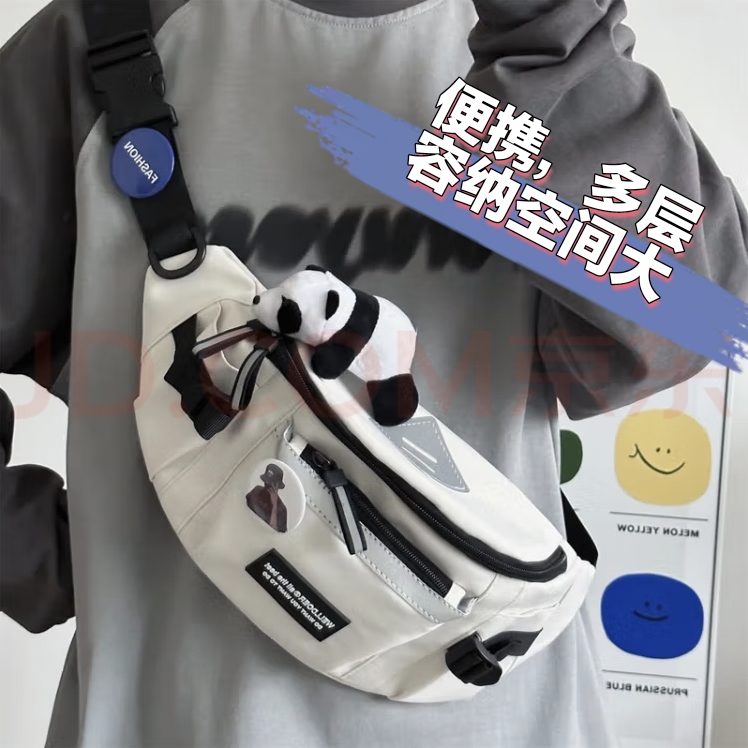 卡卡树斜挎包男休闲胸包女韩版背包潮流大容量运动手机包 白色(熊猫挂件+徽章)