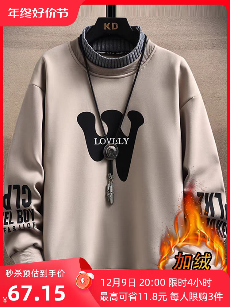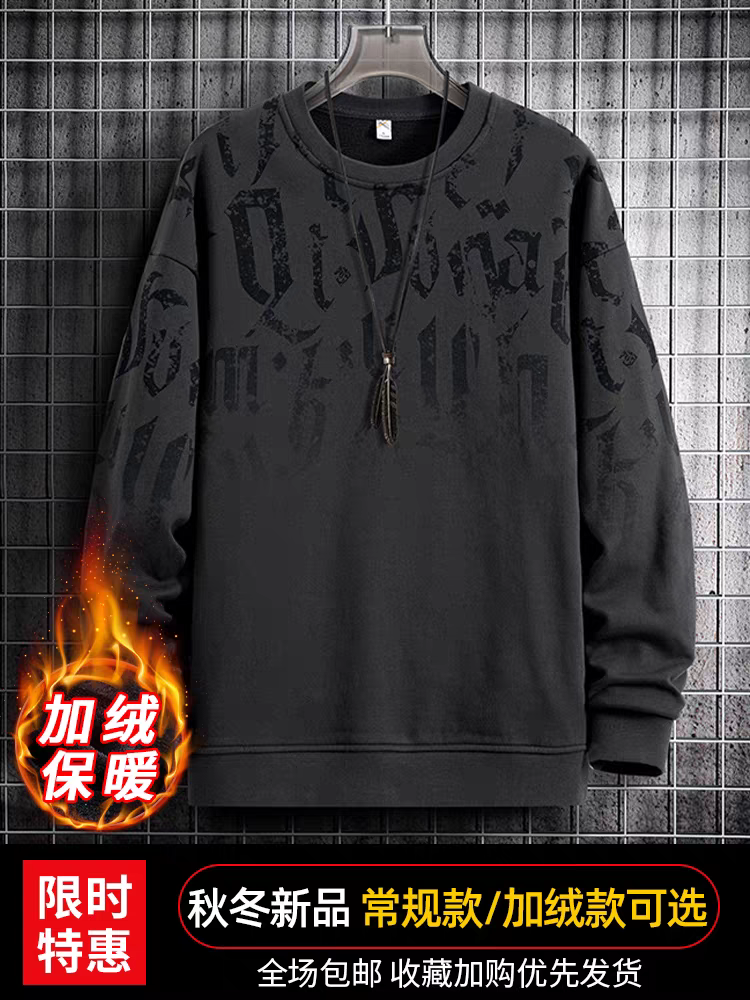 啄木鸟男士重磅圆领卫衣2023新款秋冬季加绒宽松纯棉打底衫潮外套