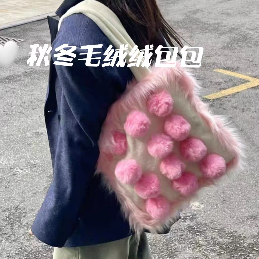 YMBHZ毛绒包包女大容量粉色少女心可爱毛球手提单肩托特包毛毛包