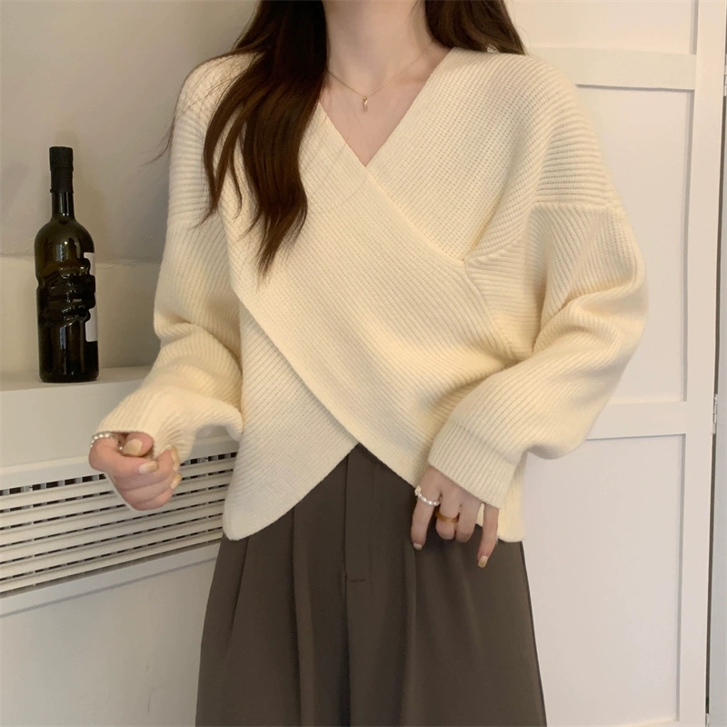 白色V领毛衣女秋冬短款内搭温柔系上衣慵懒风宽松加厚打底针织衫